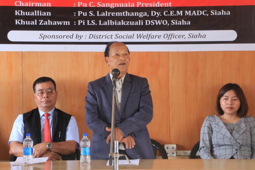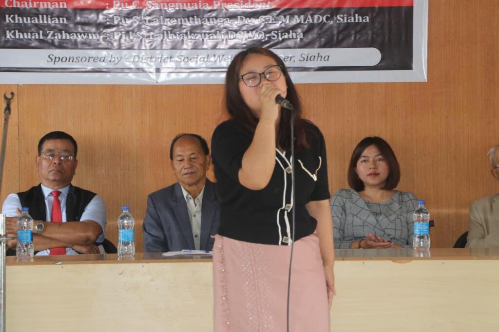 Guest of Honour Pihnô LS. Lalbiakzuali, District Social Welfare Officer (DSWO), Siaha chhaota biereina hnei hra ta, Râh asosâhpa râh liah maih heta kô lâta uhtheipazy za ei ta, ama zachhihna chhao ama pabohsa tyh. Eima District lia heta thyutliapazy paritheipa tao ta iahzaipa hluh kaw ei ta, cha hnaihta, atanoh ta he su liata â vypazy kô uhtheipazy hmah châ hra u la, ei uhthei tu ha tah leipa ta, thyudyupazy paritheipa ama pathleih thei n’awpa ta hmahla hra ta, paritheipa adyuhna kyh liana heta, uhtheipa experience hnei hluhpa nama châna hawhta paritheipa namâ dyuh chyu hra awpa ta ei châ haw ei, tahpa ta pasyunabie pha kawpa a reih.
